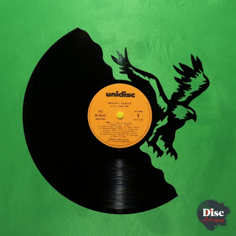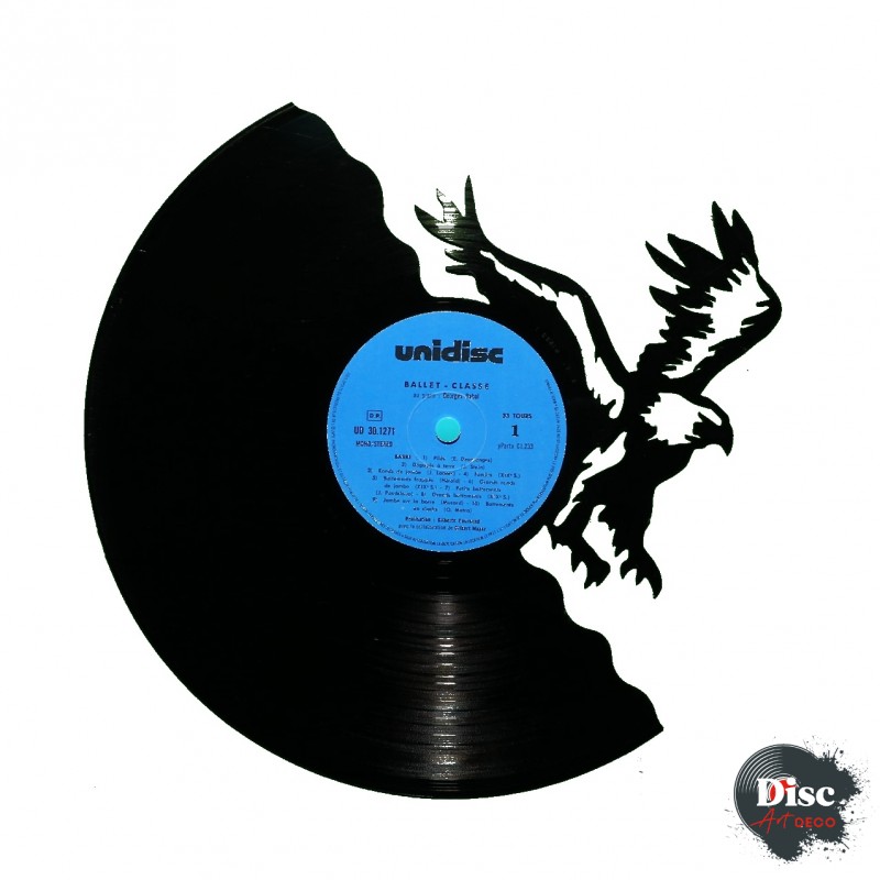 Disque vinyle découpé, représentant un aigle.
