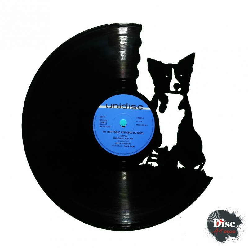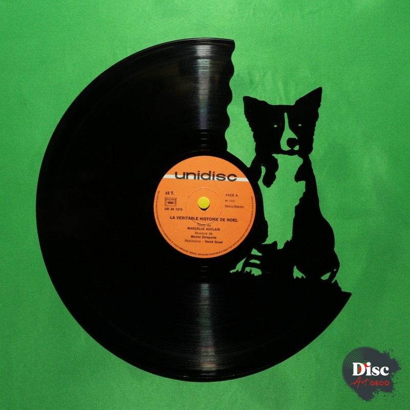 Disque vinyle découpé artisanalement, à la main, à l'aide d'une scie à chantourner.