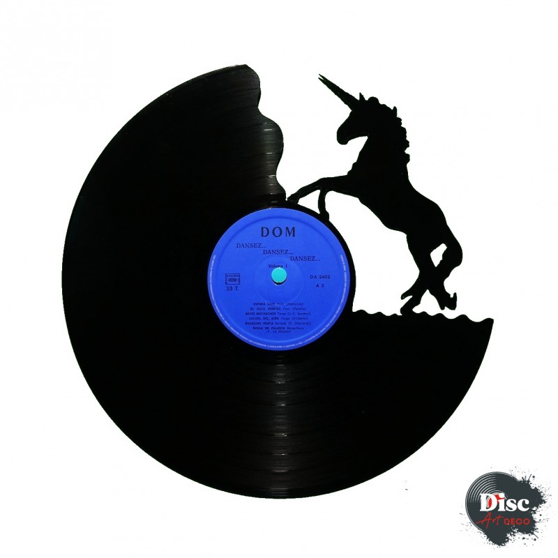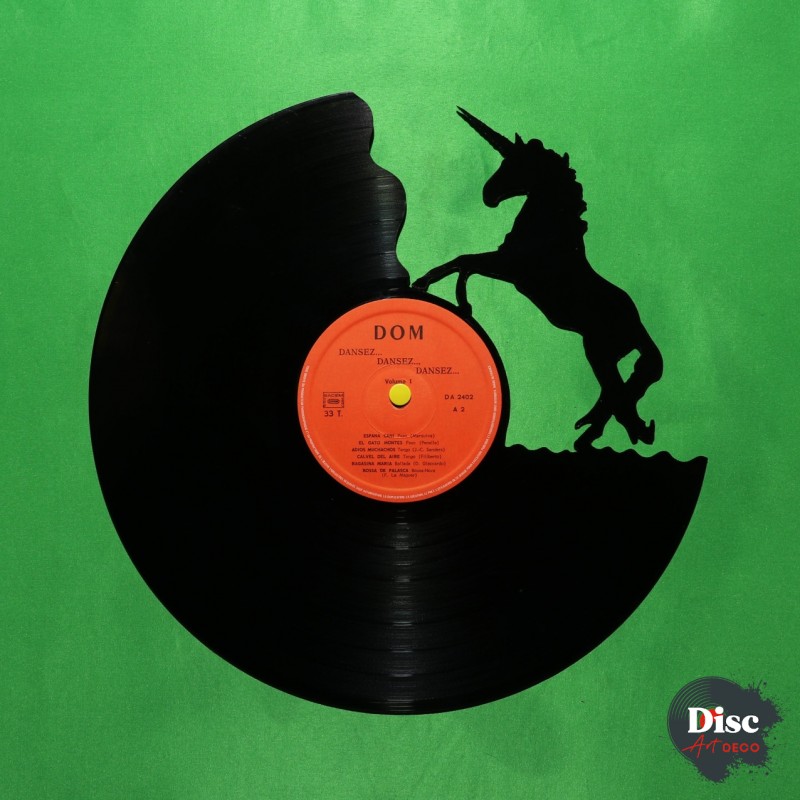 Disque vinyle découpé, représentant un licorne.