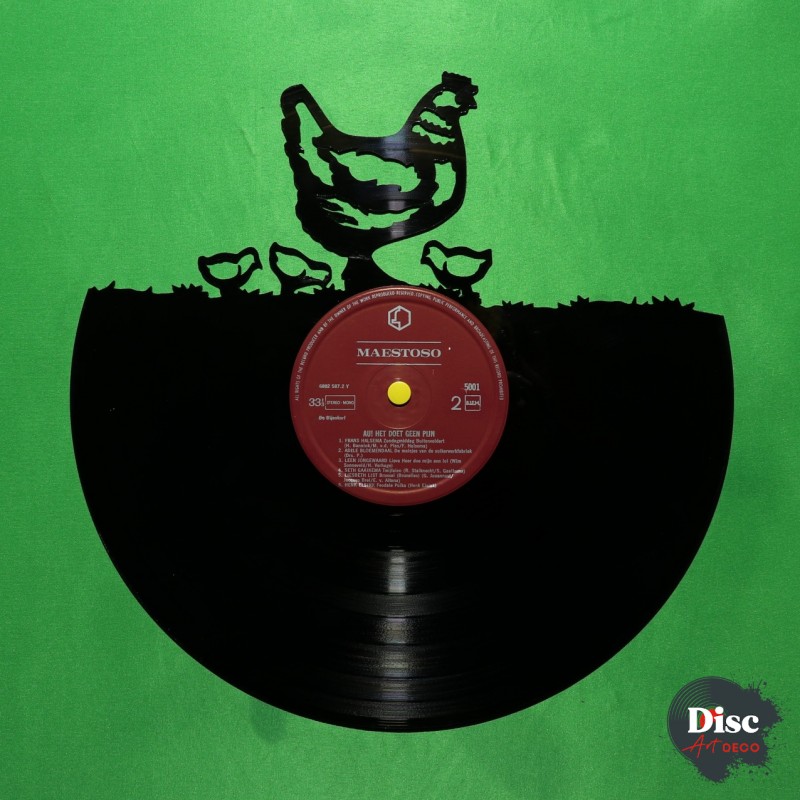 Disque vinyle découpé artisanalement, à la main, à l'aide d'une scie à chantourner.