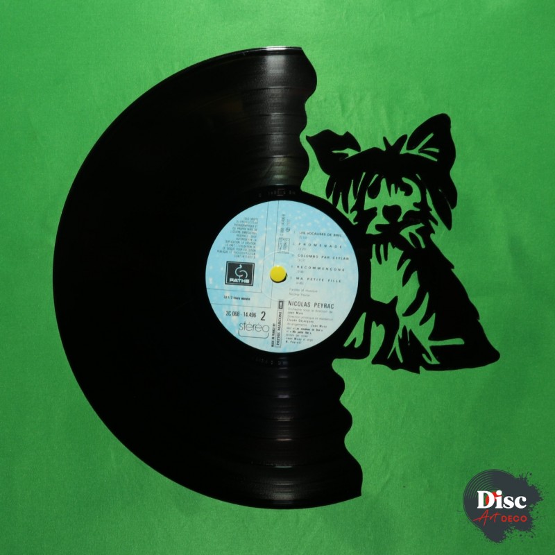 Disque vinyle découpé artisanalement, à la main, à l'aide d'une scie à chantourner.