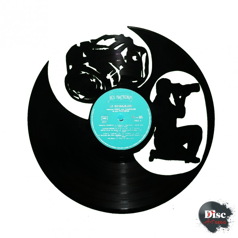 Disque vinyle découpé artisanalement, à la main, à l'aide d'une scie à chantourner.