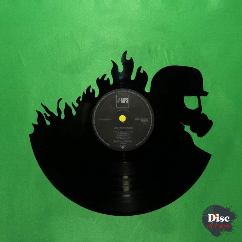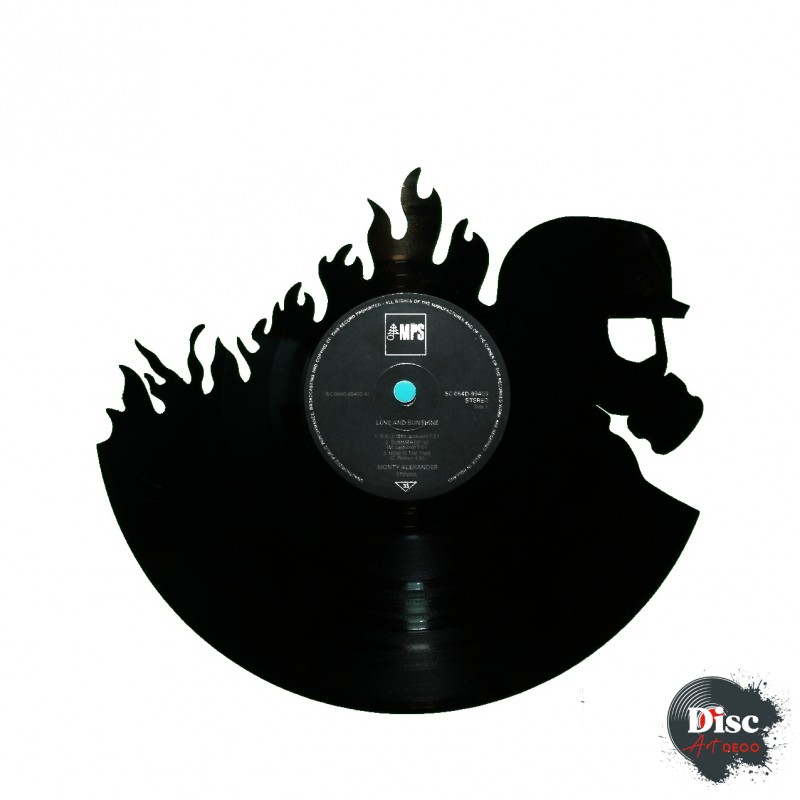 Disque vinyle découpé, représentant des pompiers.