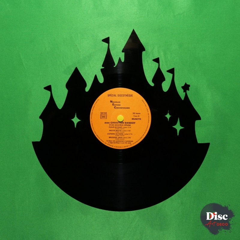Disque vinyle découpé artisanalement, à la main, à l'aide d'une scie à chantourner.