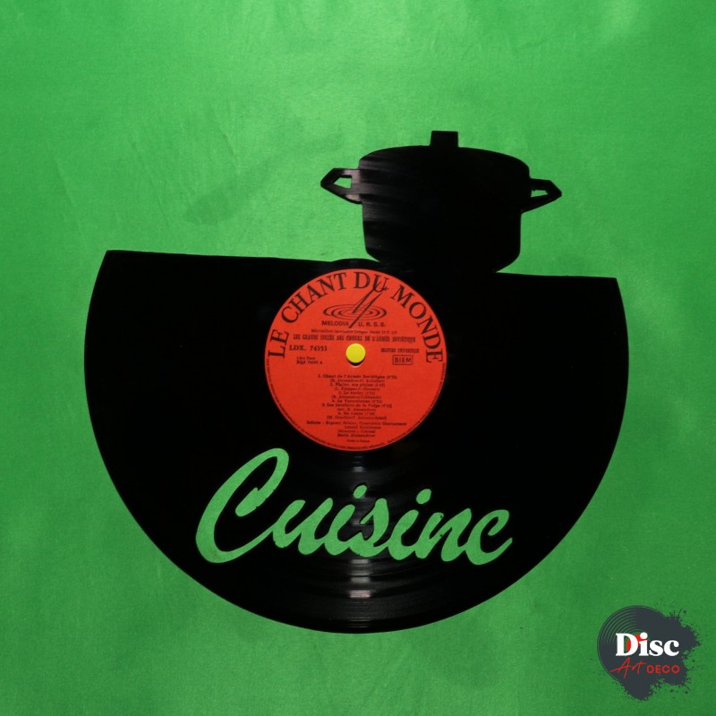 Disque vinyle découpé artisanalement, à la main, à l'aide d'une scie à chantourner.