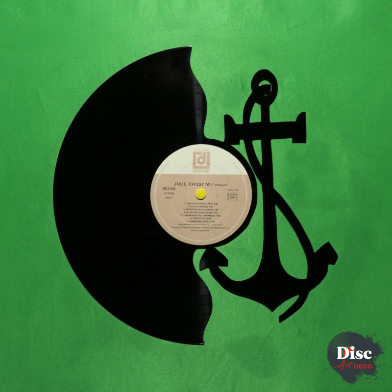 Disque vinyle découpé artisanalement, à la main, à l'aide d'une scie à chantourner.
