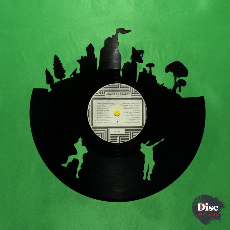 Disque vinyle découpé artisanalement, à la main, à l'aide d'une scie à chantourner.