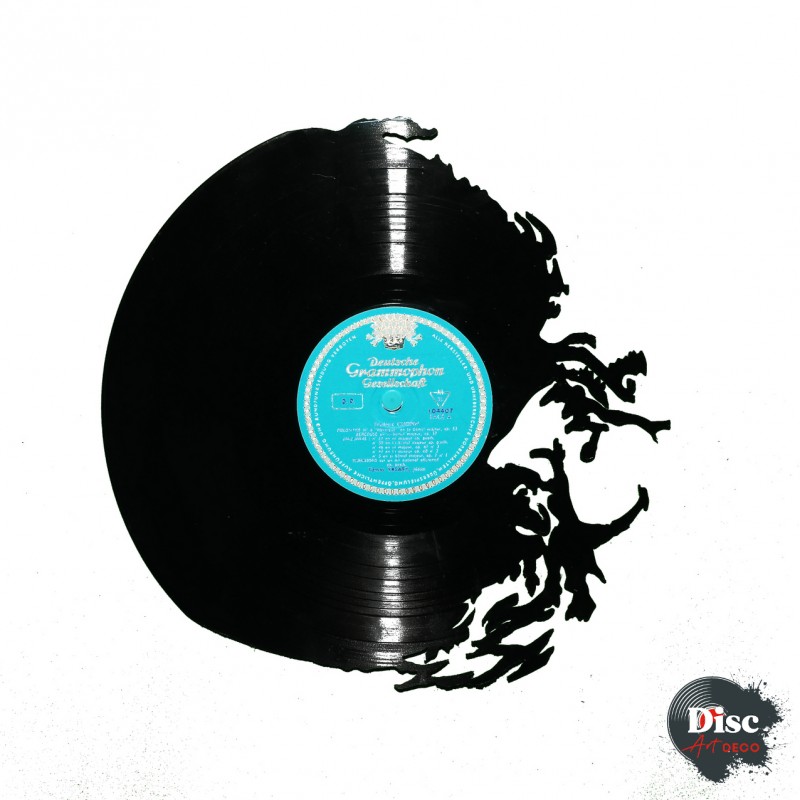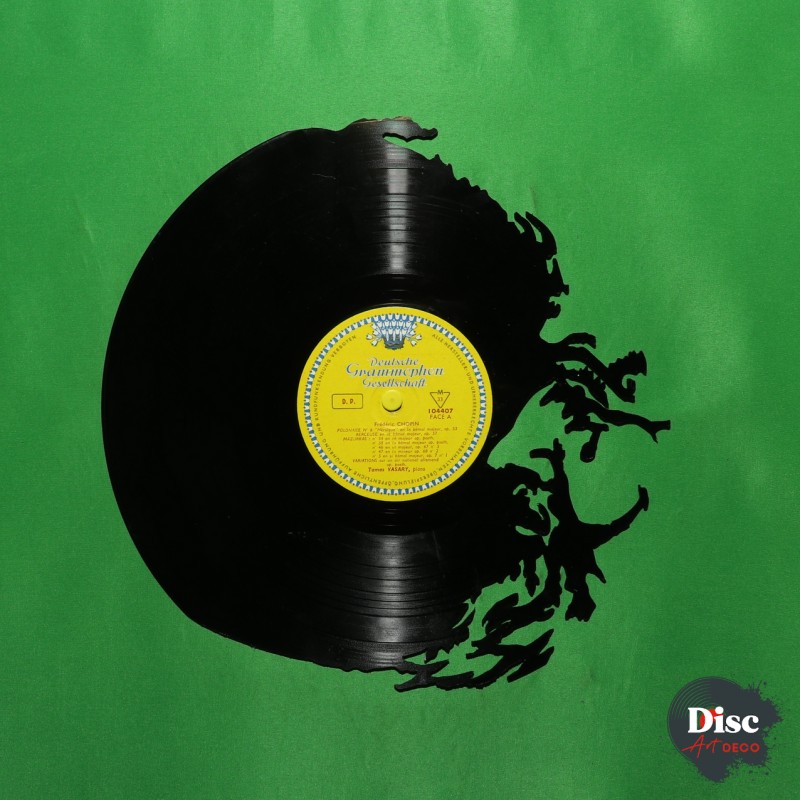 Disque vinyle découpé artisanalement, à la main, à l'aide d'une scie à chantourner.