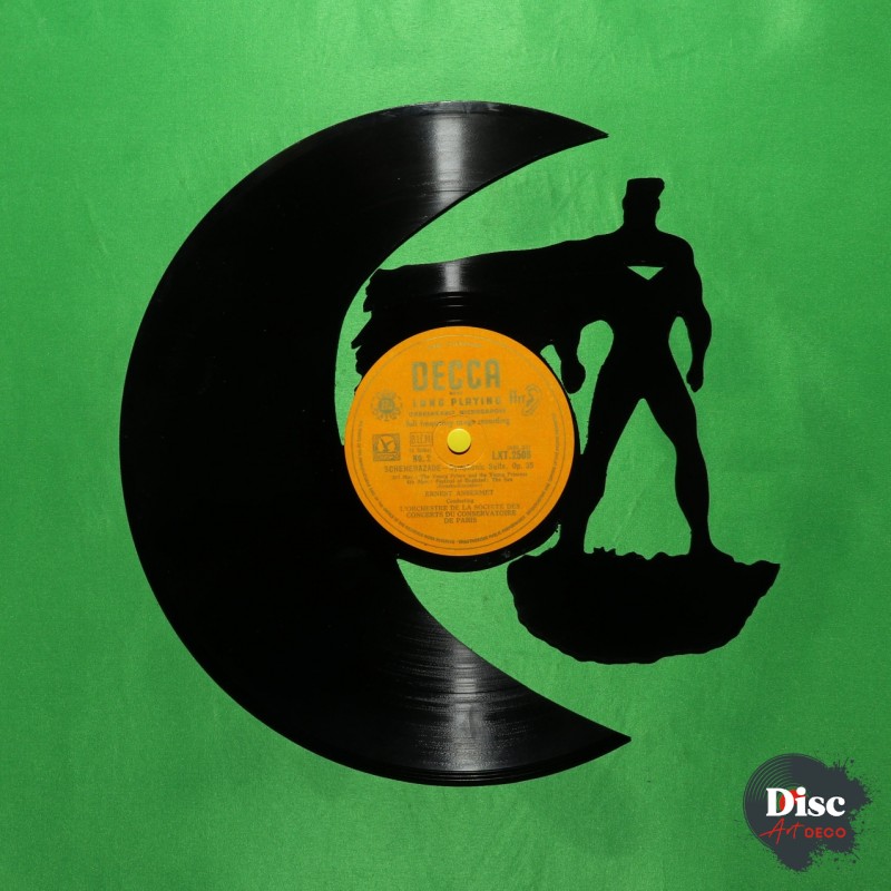 Disque vinyle découpé, représentant un super héros.