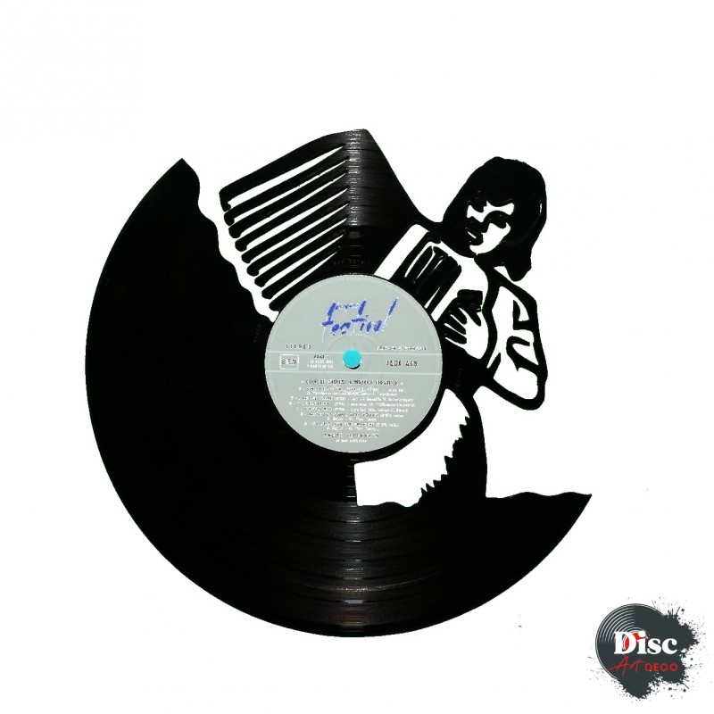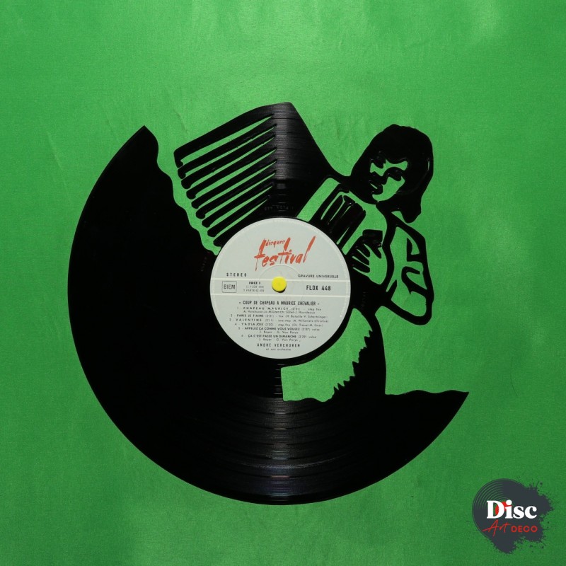 Disque vinyle découpé artisanalement, à la main, à l'aide d'une scie à chantourner.