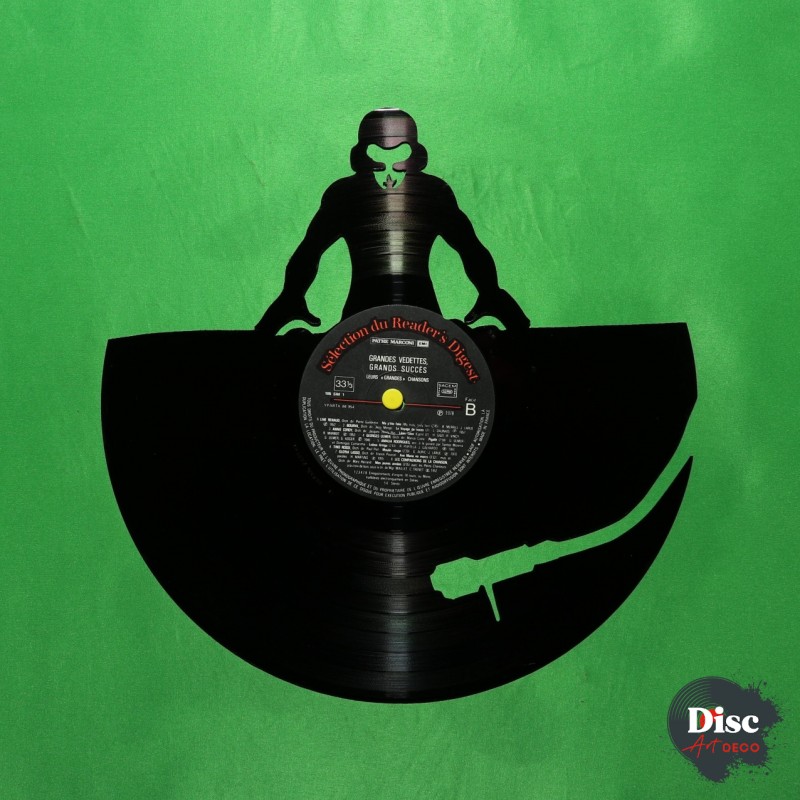 Disque vinyle découpé artisanalement, à la main, à l'aide d'une scie à chantourner.