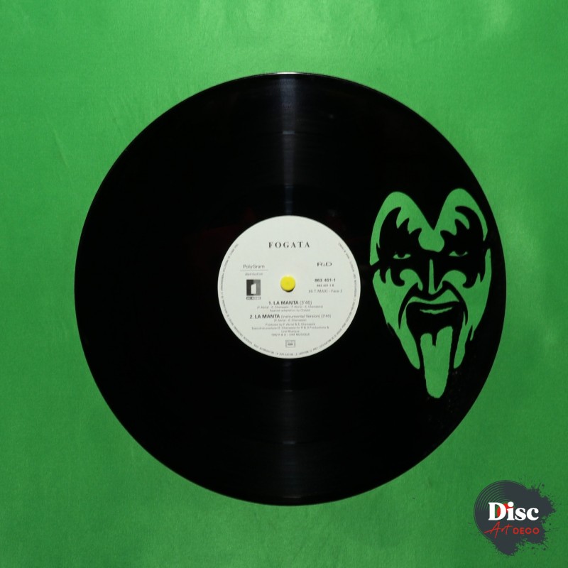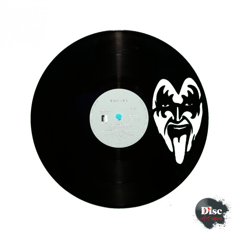 Disque vinyle découpé, représentant le groupe Kiss.