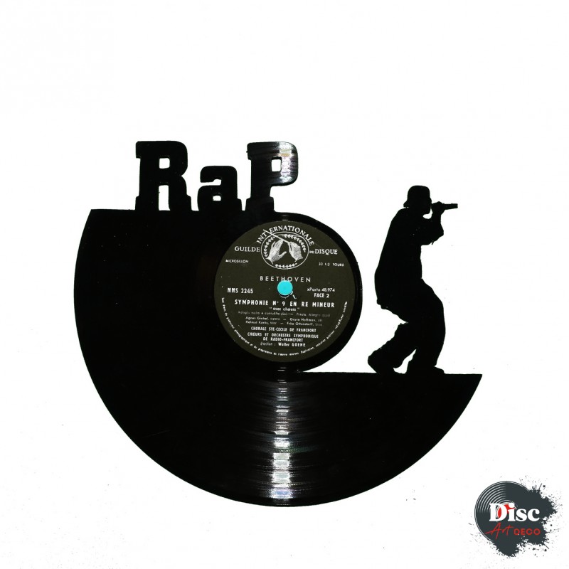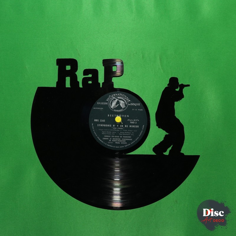 Disque vinyle découpé, représentant un rappeur.
