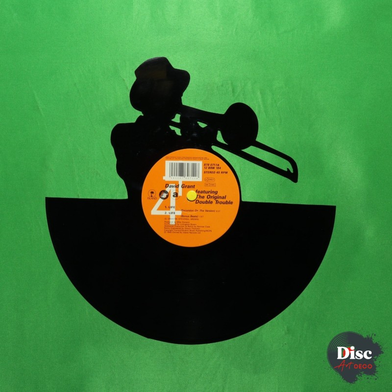 Disque vinyle découpé artisanalement, à la main, à l'aide d'une scie à chantourner.