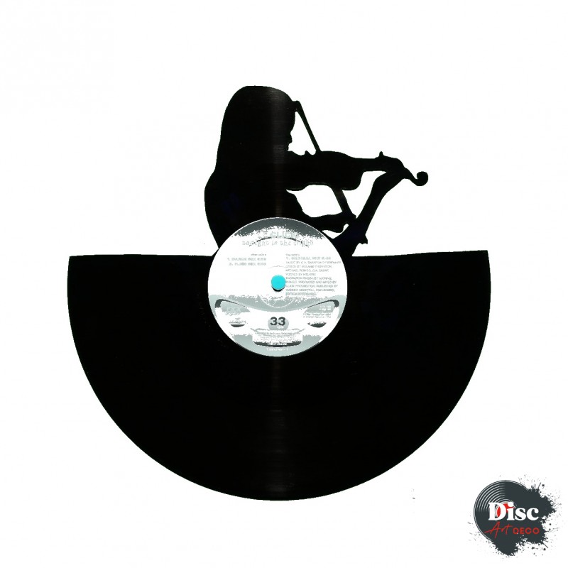Disque vinyle découpé, représentant un violoniste.