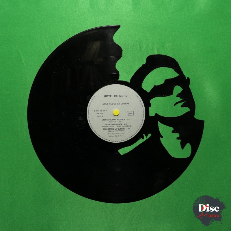 Disque vinyle découpé artisanalement, à la main, à l'aide d'une scie à chantourner.