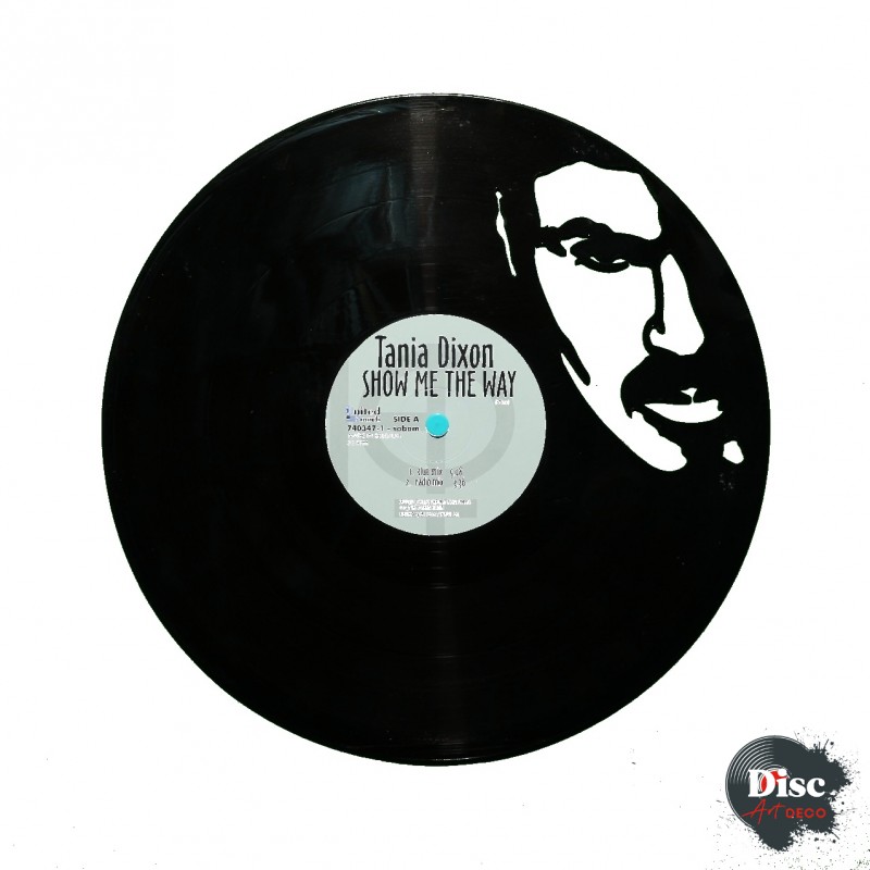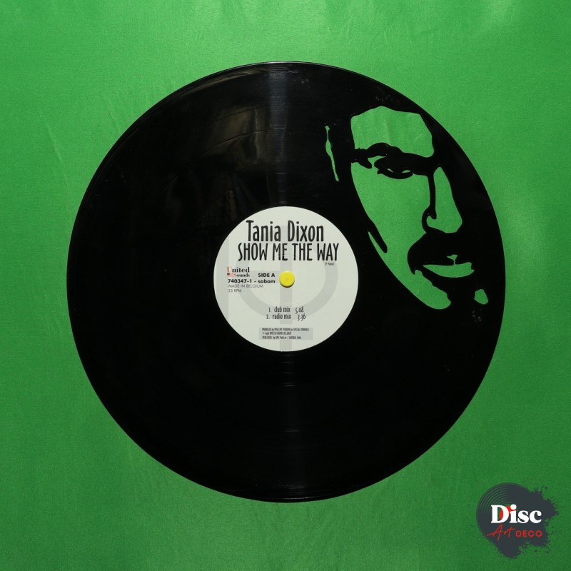 Disque vinyle découpé artisanalement, à la main, à l'aide d'une scie à chantourner.