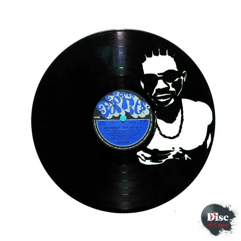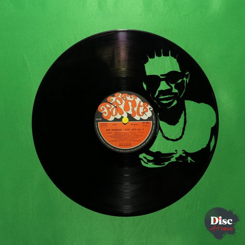 Disque vinyle découpé artisanalement, à la main, à l'aide d'une scie à chantourner.