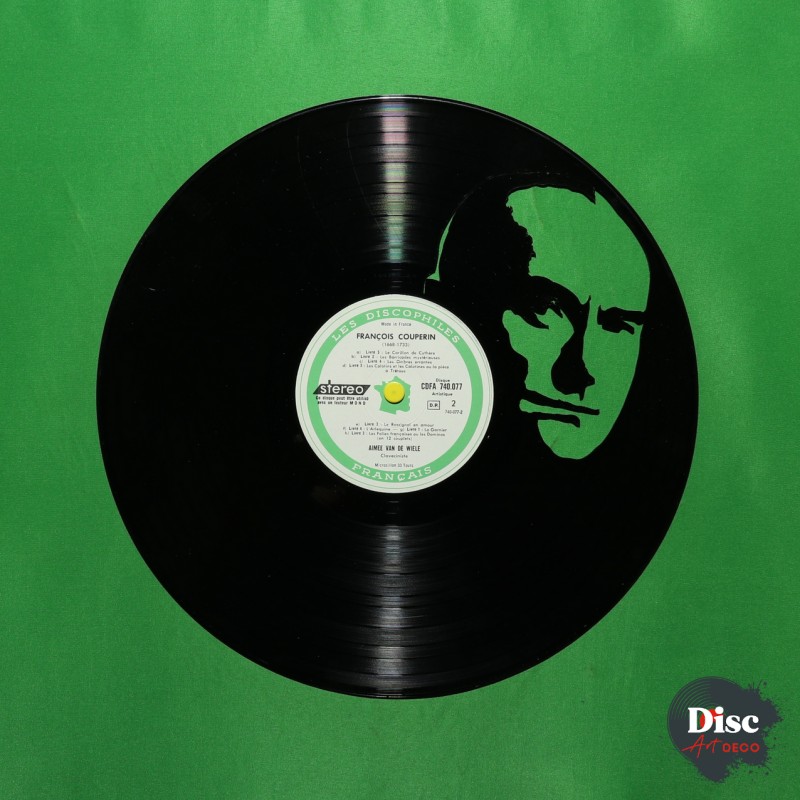 Disque vinyle découpé artisanalement, à la main, à l'aide d'une scie à chantourner.
