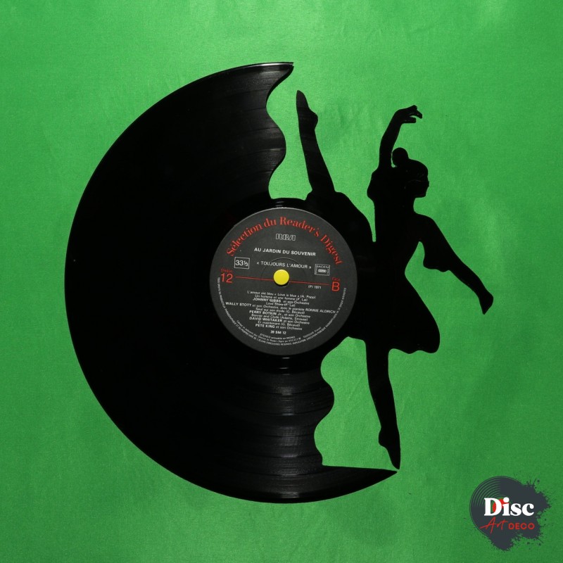 Disque vinyle découpé artisanalement, à la main, à l'aide d'une scie à chantourner.