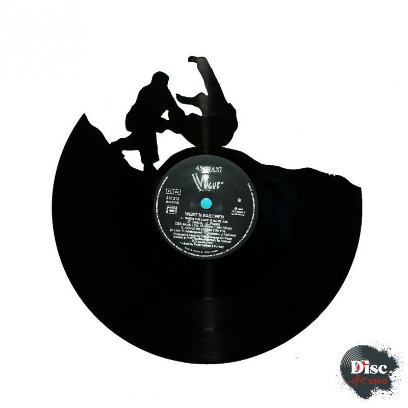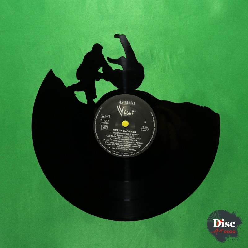 Disque vinyle découpé artisanalement, à la main, à l'aide d'une scie à chantourner.