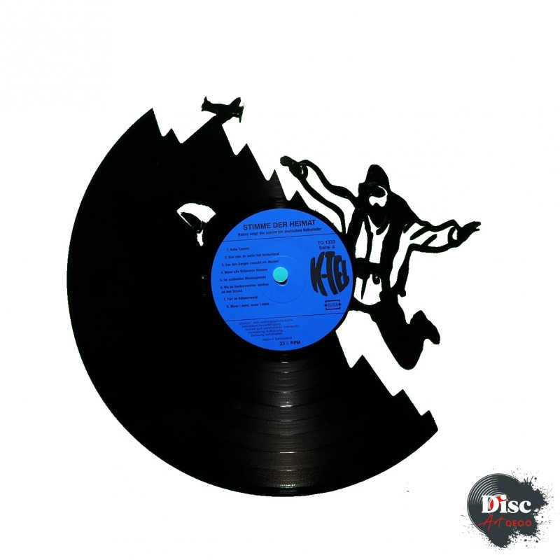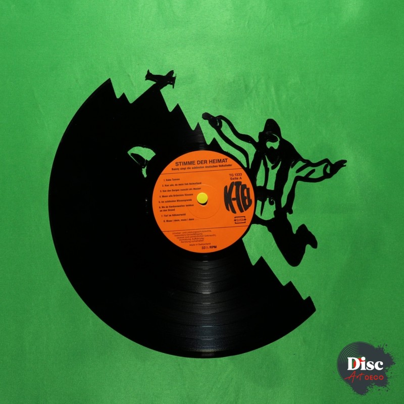 Disque vinyle découpé artisanalement, à la main, à l'aide d'une scie à chantourner.