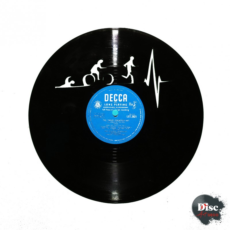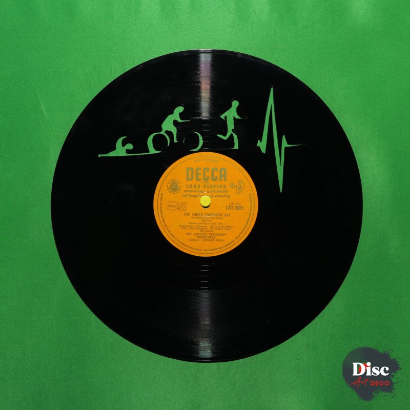 Disque vinyle découpé artisanalement, à la main, à l'aide d'une scie à chantourner.