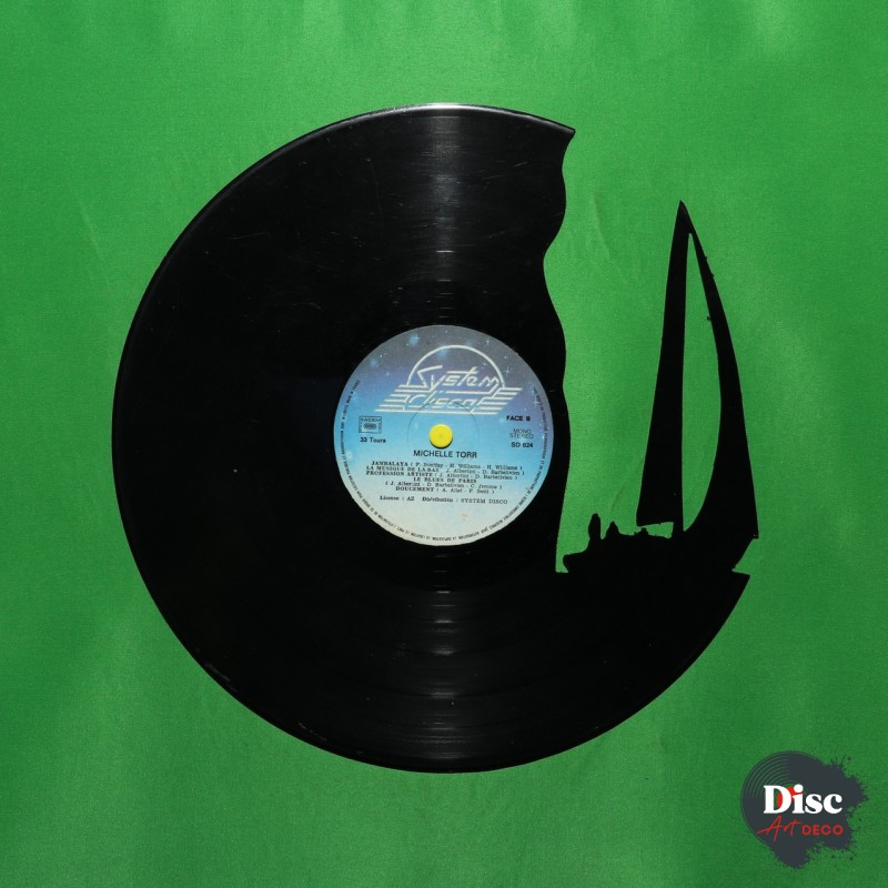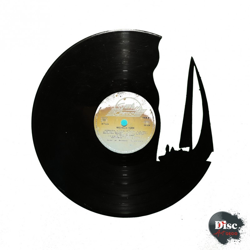 Disque vinyle découpé, représentant un voilier.