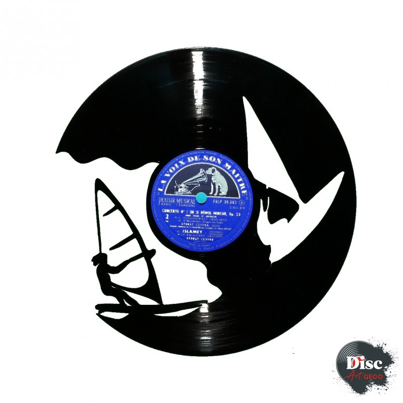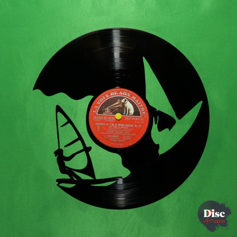 Disque vinyle découpé, représentant un Wind surfeur.