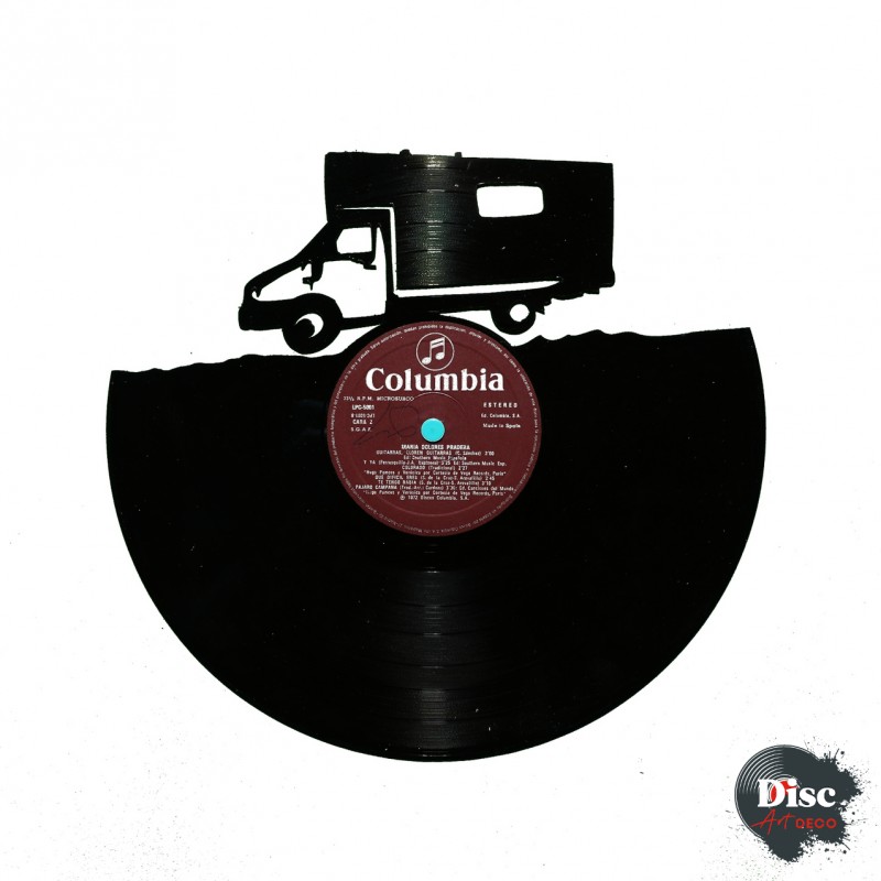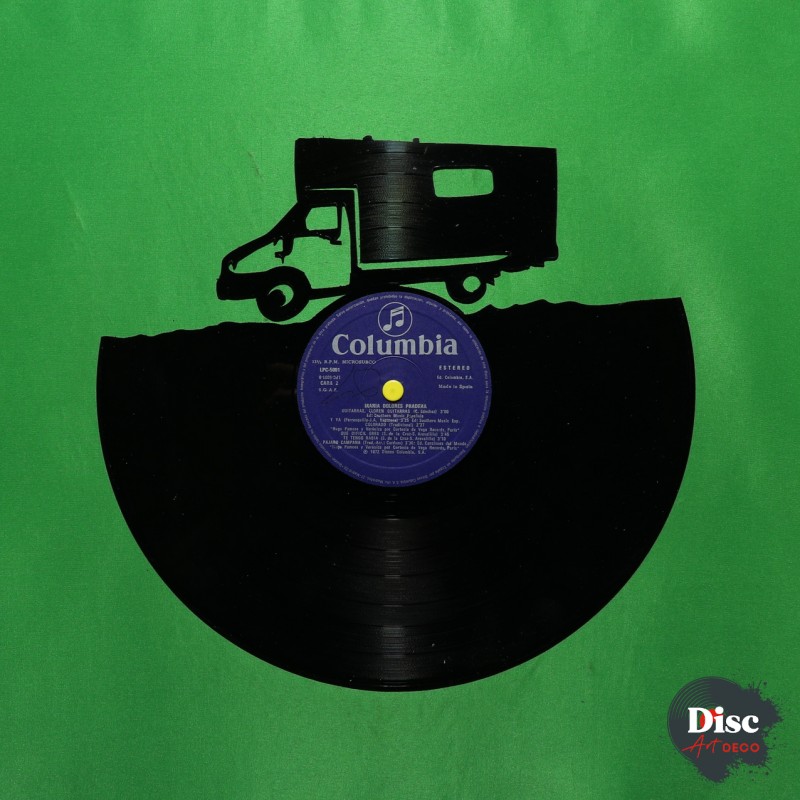 Disque vinyle découpé, représentant un Camion aménagé.