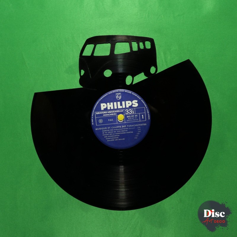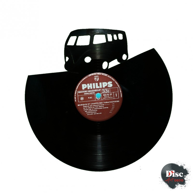 Disque vinyle découpé, représentant un combi Volkswagen.